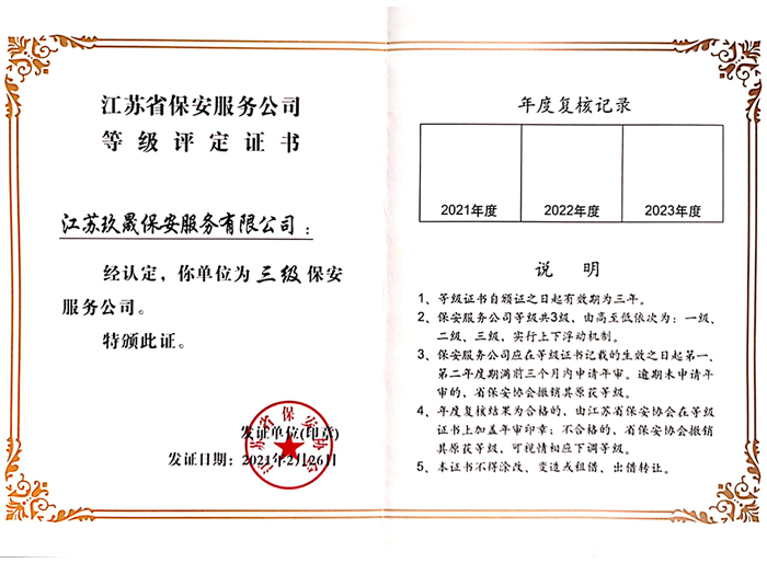 江蘇玖晟保安服務有限公司成立于江蘇省昆山市千燈鎮。注冊資金:2000萬,是擁有省公安廳頒發的保安服務許可證的企業【蘇公保服20170046】,也是昆山市保安協會常務理事單位。